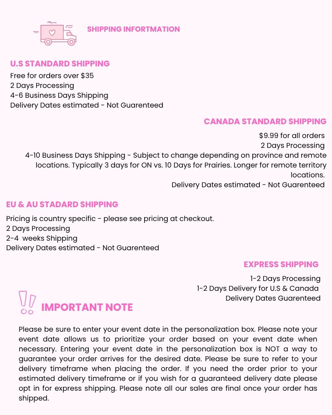 Express Shipping is available for Canada and US orders. Express Shipping typically takes 1-3 business days.